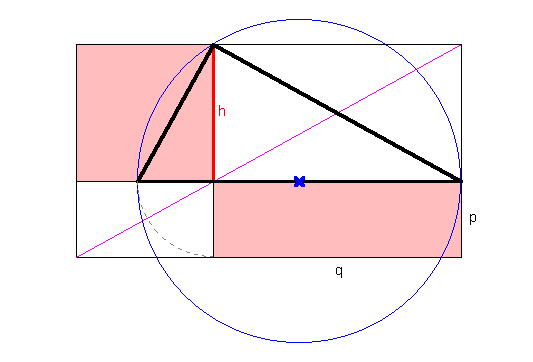 Das rötliche Rechteck und das rötliche Quadrat sind gleich groß. Zusätzlich ist ein Dreieck konstruiert.